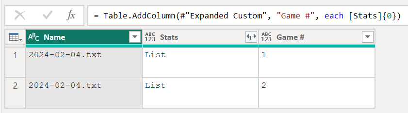 Remove other columns and expand the list of games(Stats column). Now I add the “Game #”, which is the first value in each list of stats.