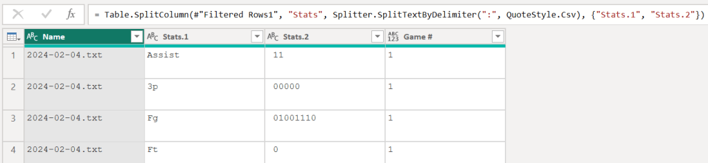 Next in order is expanding the Stats column yet again to get a row for each stat per game. Filter the table to only those rows containing “:” in the Stats column and splitting by the “:” delimiter.
