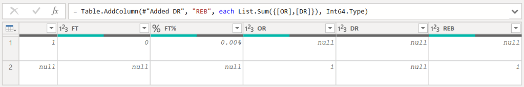 I began invoking functions to end up with the columns i wanted to load to model. To handle the null values when calculating the columns PTS and REB, i used List.Sum as adding a value and null returns null.