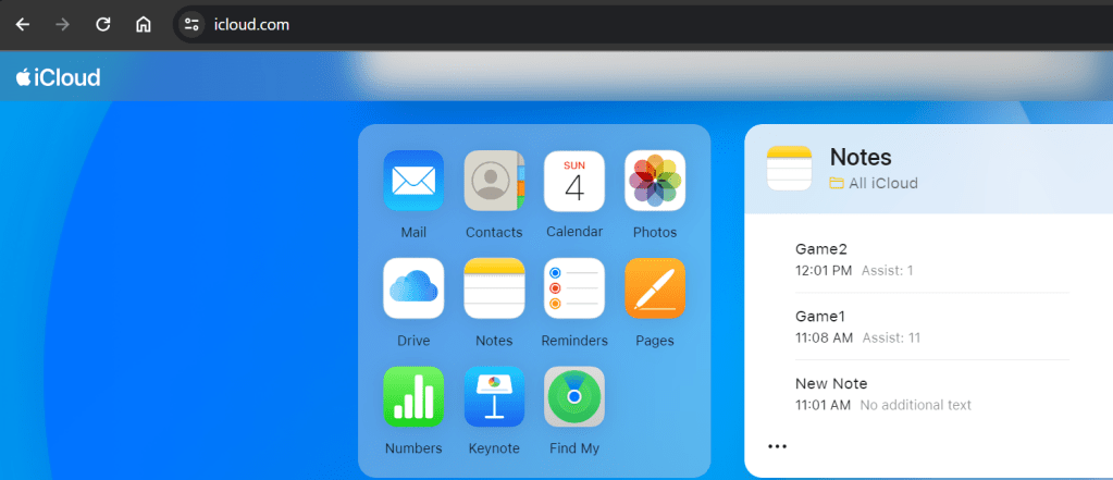 I used the same template for the 2nd game, and my intention was to import the data into Power BI from text. I visited icloud.com in my browser, where i can see my notes.